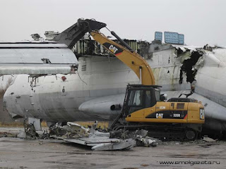 Честно говоря, тяжело было смотреть на процесс превращения самолёта в груду обломков. От разламываемого самолёта шёл треск и, как казалось, даже стон. "Старик" скрипел всеми своими стрингерами, не враз поддаваясь усилиям машины разрушения. Хвостовая часть фюзеляжа, отломанная в самом начале, скрежетала по бетону, когда "дракон" отламывал самолёту крылья одно за другим.