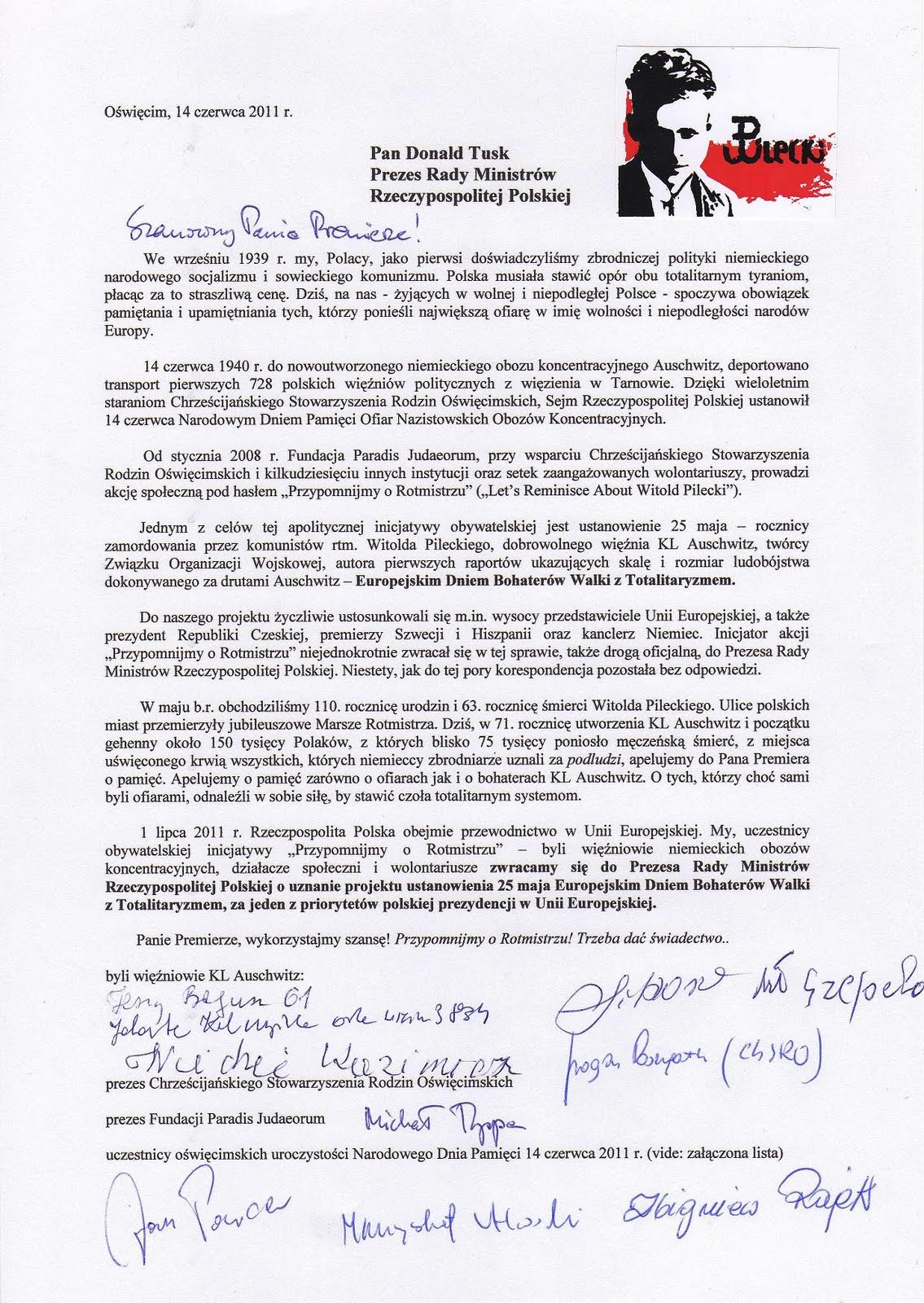 5) Apel do premiera Donalda Tuska z 14 czerwca 2011 r. Skan udostępniony w materiale z 14 czerwca 2011 r. "Rotmistrz Pilecki priorytetem polskiej prezydencji w Unii Europejskiej" . Zob. także link