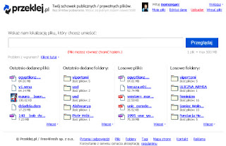 Aż natrafiłem na Przeklej i zaskoczyła mnie znacznie większa szybkość uploadu niż w znanych i renomowanych hostingach. Pliki pomykają na serwerek, aż miło i granatowieją świeżutkimi linkami plików, zorganizowanych przez nas w foldery, nader smakowicie. Nic tylko używać. Przeklej.pl daje nam funkcję wysłania pliku mailem, ściągnięcia go na dysk komputera oraz wklejenia niezbyt może efektownego, ale czytelnego banera na naszą stronę (uczyniłem to, spójrzcie na sam dół tej strony jak wygląda opisane rozwiązanie webmasterskie.