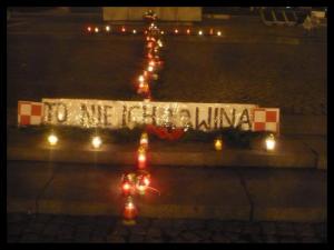 Z oburzenie przyjęliśmy informację o tym, że w późnych godzinach wieczornym ułożony przez uczestników miesięcznicy krzyż z kwiatów i zniczy został otoczony przez Policję z wydziału kryminalnego. Funkcjonariusze po tym jak zajęli teren, uniemożliwiali przechodniom zapalania zniczy, czy składania kwiatów. KWP przyznała” „Rzeczywiscie na Starym Rynku policjanci interweniowali w związku z wywieszeniem na pomniku szarfy z napisem „Tusk odpowiesz za Smoleńsk” – oświadczył nadkom. Maciej Daszkiewicz z KWP w Bydgoszczy. - Na miejscu przeprowadzono oględziny i zabezpieczono szarfę oraz kartonową tablicę jako dowody rzeczowe. Policjanci z komisariatu Bydgoszcz Szwederowo prowadzą postępowanie w sprawie o wykroczenie w kierunku art. 63a par. 1 kodeksu wykroczeń” – dodał.” (za Niezależną,pl)