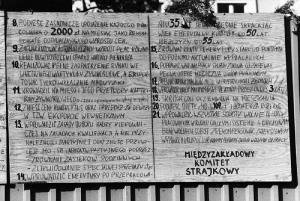 Fotografia przedstawia "Dekalog Pierwszych Wolnych Związków Zawodowych", gdzie w punkcie 21 mówi się o wszystkich sobotach wolnych od pracy-za to ginęli