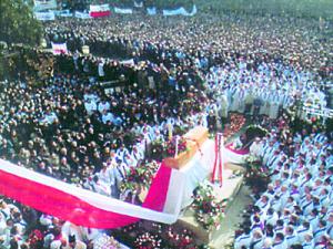 To ks. Popiełuszko gromadził tysiące ludzi z powiewającymi flagami, zjeżdżających z różnych stron i zapełniających nawet pobliskie uliczki, kiedy do nich przemawiał.