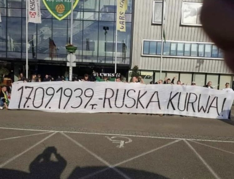 Kibice holenderskiego Den Haag, zaprzyjaźnionego z kibicami warszawskiej Legii z wymownym transparentem