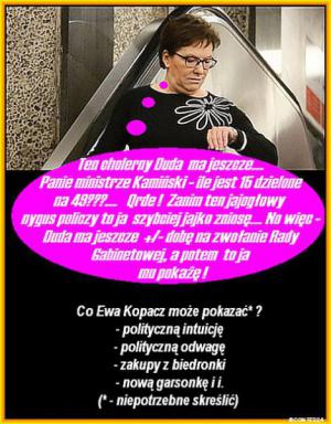 Majestat pani premierz nie może przeżyć tego, że prezydent Duda od 6 sierpnia urzęduje na całego, nawet się rozjeżdża – a to Tallin, a to Berlin za chwilę, potem Paryże, Pekiny, New Yorki itd., a ona od 6 sierpnia wciąż apeluje i apeluje do niego o zwołanie Rady Gabinetowej, a on nic ! I wszystkie wysiłki premiery spływają po nim jak za przeproszeniem – po kaczce woda...