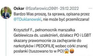 Nagłówek tej informacji potem powieliło wiele osób na mediach społecznościowych: „Krzysztof F., pełnomocnik marszałka Olgierda Geblewicza do spraw uzależnień, został skazany za pedofilię, nakłanianie dzieci do spożywana narkotyków i posiadanie znacznych ilości substancji odurzających. W chwili przestępstwa poszkodowany chłopiec miał 13 lat, a dziewczynka 16. To dzieci znanej parlamentarzystki.” - w tym, zrobił to młody działacz PiS-u, Oskar Szafarowicz. I teraz za to grozi mu wywalenie z uczelni. Oskarża się go o to, że tym podawaniem dalej tej wiadomości doprowadził 13-to letniego chłopca poniżonego przez pedofila do samobójstwa.
