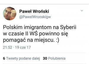 Jest oczywiście tak, że można i trzeba pomagać ofiarom wojny w Syrii, które dziś nie mają gdzie mieszkać, są bez środków do życia, ale nie szturmują Europy i nie chcą opuszczać swojej ziemi. Pomagają im na bieżąco polski rząd, polski kościół, organizacje humanitarne. Redaktor Wroński wie o tym doskonale, sięga jednak do czasów odległych, do polskiej Golgoty Wschodu, do morderczych deportacji, żeby udowodnić swoje racje. Szyderczo - to najdelikatniej powiedziane. Czytających ten wpis trafia dosłownie szlag. Padają mocne słowa pod adresem jego autora, na przykład: „bydlę”. Inni piszą: Szok! Szokujące! Paweł Wroński pochodzi z redakcji gazety trzymającej się ponoć najwyższych, bo europejskich standardów dziennikarstwa, nie może być więc mowy o pomyłce, o jakimś niezrozumieniu tematu. No bo sens tych słów nie wymaga nawet interpretacji. Tak jak w czasach II WŚ nie można było pomóc zesłańcom na Syberii, tak i teraz nie można realnie pomóc ofiarom wojny syryjskiej, tam na miejscu, trzeba ich - trzymając się logiki Pawła Wrońskiego - zabrać do nas, do Polski. Z tej nieludzkiej ziemi. To bez znaczenia, że Polaków, z ich ojczyzny, deportowano w bydlęcych wagonach na Syberię pod groźbą kary śmierci tam, gdzie nie chcieli być. Syryjczycy z obozów w Libanie są nadal u siebie, są razem, w sowim kręgu kulturowym.
