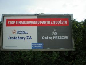Przypatrzmy się plakatowi: ileż tu zabiegów sugerujących podświadomości właściwy pogląd? Nie chodzi bynajmniej o sprawy merytoryczne. Plakat sugeruje walkę jasnego, kolorowego dobra z ciemnym, szarym złem. Oczywiście dobro to "my", a zło - "oni". Ponadto partyjne pomarańczowe barwy Platformy Obywatelskiej na białym tle kolidują z szaro-białymi, niezgodnymi z rzeczywistymi barwami symboli PiS. A krzyczący czerwony napis "stop"? To z jakich finansów korzystała PO przez ostatnie dwie kadencje swoich rządów i kto tu naprawdę rządził? I czy z plakatu ma wynikać rodzaj jakiejś intifady czy innej świętej wojny jasnego dobra z ciemnym złem, jak to w wywiadach sugerował ongiś specjalista od drogich zegarków co ostatnio zrezygnował z polityki i przeszedł do biznesu?