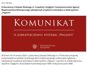 W dniach 18-19 czerwca 2024 r. prokuratorzy Zespołu Śledczego nr 3 Prokuratury Krajowej przeprowadzili w siedzibie Centralnego Biura Antykorupcyjnego w Warszawie oględziny i zabezpieczyli urządzenia wchodzące w skład systemu „Pegasus”. Czynność ta została wykonana wspólnie z biegłymi z Biura Badań Kryminalistycznych ABW i funkcjonariuszami ABW.