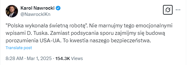 Doskonały wpis Karola Nawrockiego komentujący antyamerykańską rewoltę Tuska. Zacytowanie świetnych słów Trumpa o Polsce - jest. Zdeprecjonowanie Tuska - jest. Apel o budowę relacji z USA, w tym na linii z UA - jest. Głos rozsądku i stabilności w zalewie chłamu rządzących