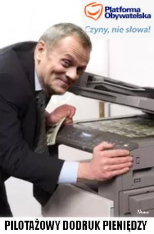 Aby proceder masowego wzrostu liczby milionerów ukrócić, drukarki pieniędzy trafią wyłącznie do komitetów Platformy Obywatelskiej. Tam będą rozpatrywane wnioski członków Platformy Obywatelskiej a powołane komisje (złożone z niezależnych i niezawisłych ekspertów) – natychmiast wydawać będą zgodę na dodruk pieniędzy na miejscu. Procedura będzie więc znacznie prostsza niż w czasach, gdy agent Bolek musiał wypisać kupon, potem złożyć go w kolekturze toto-lotka i czekać na wygraną, która była mu potrzebna na zakup pralki czy lodówki...