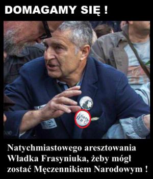 Wprawdzie Rysiu Petru wezwał swoich zwolenników do uwolnienia Władka – to przecież nikt Władka Frasyniuka nie aresztował! Mimo tej wirtualnej wojny, mimo wirtualnemu stanowi wojennemu i zmyślonych aresztowaniach – władza nie powinna pozwolić na zamianę Polski w dom wariatów, w którym żyjący w stanie wojennym debile zdominują nasze życie. Organizacja, która ogłosiła, że będzie działać wbrew prawu powinna być zdelegalizowana, a próby łamania prawa – ukarane.
