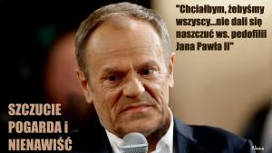 Autentyczny diabeł stara się więc splugawić świętość Jana Pawła II pod pozorem „miłości”. Udając przeciwnika „szczucia” – diabeł Tusk nazywa Jana Pawła II „pedofilem” mówiąc z wyrachowaną przewrotnością podczas sabatu w Żywcu: „Chciałbym, żebyśmy wszyscy – wierzący czy niewierzący – którzy posługują się etyką i zdrowym rozsądkiem, nie dali się nawzajem naszczuć ws. pedofilii Jana Pawła II (sic!)”.