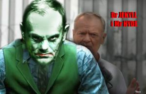 Tusk ma Polaków za głupków, którzy nie pamiętają, że Tusk po przechadzce z Putinem na sopockim molo przestrzegał przeciwników jego resetu z Putinem i Rosją „taką jaka jest”, że „z premierem Putinem przypilnujemy, by nikt piachu w tryby nie sypał”… Dzisiaj „człowiek Kremla w Warszawie” - jak oceniła Tuska propaganda Putina, odegrał przed zbudowanym przez PIS murem na granicy z Białorusią i w obecności swej niemieckiej promotorki kolejny skecz. Ale to nie był skecz na miarę Monty Pythona, czy też roli prezesa klubu „Tęcza” z „Misia” Stanisława Barei! To był życiowy spektakl Tuska w nowej wersji noweli Doktor Jekyll i mister Hyde (ang. Strange Case of Dr Jekyll and Mr Hyde), napisanej przez szkockiego autora Roberta Louisa Stevensona. Noweli, która jest portretem psychopatologii oraz podwójnej osobowości.