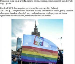 Nie wiem, gdzie te pedały maszerowały (na pewno w Warszawie), ale okazuje się, że flagę i godło panswowe mają w dupie, bo oba symbole znieważyli oraz sprofanowali.