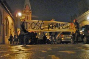 Po Eucharystii zgromadzenie przy słowach roty, wyruszyli na ulice miasta. Skandowali też hasła: Uczciwe wybory, nie jak do tej pory; Chcemy głosować a nie statystować; Każdy to wie PKW liczy źle; Sprawa jest prosta, komisję szkoli Moskwa; GRU, szkoli PKW; Chcemy demokracji , a nie pajdokracji. Po 40 minutach marsz dotarł pod Urząd Wojewódzki, zgromadzeni odśpiewali hymn. Prowadzący manifestacje przewodniczący KGP Krystian Frelichowski zwrócił się do zebranych: Mimo późnej pory i zimna przyszliście tutaj. To znaczy , że losy Ojczyzny są Wam bliskie, że nie jesteście obojętni, nie składacie broni. Walczycie o lepszą przyszłość. Dziękuję! Następnie głos zabrał Pełnomocnik Okręgowy PiS poseł Tomasz Latos : Wszyscy mamy w pamięci wybory samorządowe, tą ogromną ilość nieważnych głosów, to wielodniowe ich liczenie. Docierało też szereg sygnałów o nieprawidłowościach, to musi niepokoić. To niej jest rzecz normalna, że w niektórych miejscach, w niektórych lokalach liczba głosów nieważnych wynosiła 1/3 i przechodzi się nad tym do porządku dziennego. Nikt się nad tym nie zastanawia, nikt tego nie kwestionuje. To nie jest rzecz normalna, że dziennikarzy , którzy próbują o tym pisać spotykają różne represje. Nie jest to normalne to, że obowiązuje często jedna prawda, prawda zgodna z linią, którą lansuje obecna władza. W związku z tym musimy się upominać o wolność mediów. Zadaniem numer jeden w najbliższej przyszłości jest nie dopuścić do skandali wyborczych i oszustw.