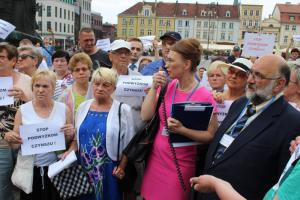 Radni PiS i mieszkańcy Bydgoszczy na konferencji prasowej zwołanej w dniu 21.09 zapowiedzieli protest przeciwko podwyższą czynszu. Jako pierwszy głos zabrał głos Krystian Frelichowski – w związku z wyczerpaniem wszystkich metod łagodnej perswazji, do których należały między innymi debaty na posiedzeniach Rady Miasta, konferencje prasowe, petycje składane przez mieszkańców na ręce Prezydenta Miasta oraz na wyraźną prośbę lokatorów mieszkań komunalnych zwołujemy akcję protestacyjną. Odbędzie się ona w najbliższy wtorek 26 września o godzinie 17.00 na Starym Rynku w Bydgoszczy. Zapraszamy wszystkich, którzy czują się poszkodowani polityką mieszkaniową władz miasta, by zademonstrować swój sprzeciw. Radna Grażyna Szabelska przypomniała, że mieszkańcy domagają się obniżki czynszów do 8zł za metr. Zwróciła też uwagę na fakt, że po ewentualnej obniżce i tak Bydgoszcz pozostanie w gronie najdroższych miast w Polsce pod względem wysokości czynszów. Zaznaczyła też, że protest będzie miał charakter pokojowy. Były wice prezydent miasta Radny Stefan Pastuszewski, Zarzucił Administracji Domów Mieszkalnych niegospodarność, wyraził też opinie, że obniżce czynszów powinna towarzyszyć częściowa, warunkowa abolicja dla osób, które popadły w zaległości płatnicze. W imieniu mieszkańców głos zabrała Ewa Molis- my już nie jesteś w stanie płacić tak wysokich czynszów, nie starcza nam na leki, jedzenie i inne opłaty.