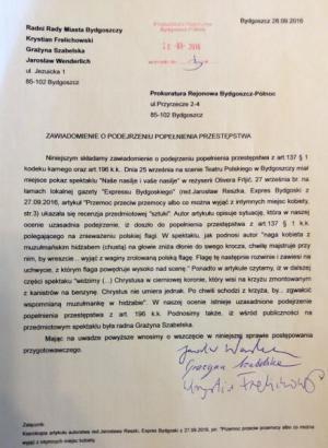 W związku ze spektaklem Nese nasilije i vase nasilije, pokazywanym w Bydgoszczy w ramach Festiwalu Prapremier, podczas to którego miało miejsce bezczeszczenie flagi polskiej ja i obrażanie uczuć religijnych radni Grażyna Szabelska, Jarosław Wenderlich, Krystian Frelichowski złożyli w dniu 28 września zawiadomienie do prokuratury zawiadomienie o podejrzeniu popełnienia przestępstwa. Wcześniej podobne pismo złożyła posłanka Anna Sobecka, później Wojewoda Kujawsko-pomorski Mikołaj Bogdanowicz