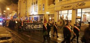 Niezależne obchody Dnia Żołnierzy Wyklętych rozpoczęły prelekcje poświęcone Niezłomnym. O godzinie 17.30 odbyła się w kościele OO. Jezuitów uroczysta Eucharystia. Po niej nastąpił w strugach deszczu, uroczysty przemarsz ulicami miasta. Na czele szła grupa rekonstrukcyjna, ludzie dzierżyli w dłoniach, flagi, pochodnie, banery poświęcone Żołnierzom Wyklętym. Tradycyjnie już uroczystości próbowała zakłócić grupka KOD-ziarzy stojąca naprzeciwko szpitala MSW, w którym po wojnie znajdowała się katownia SB gdzie zamordowano m.in. por. Leszka Białego. Dzierżyli w dłoniach transparenty obrażające pamięć żołnierzy walczących o niepodległą Polskę. Uczestnicy pochodu przywitali ich przyśpiewką „ojciec w ZOMO ty jesteś w KOD-zie, demokracja zawsze w modzie”. Przemarsz zakończył się przy obelisku upamiętniającym por. Leszka Białego. Na uczestników czekał też żołnierski poczęstunek. Wśród uczestników było trzech radnych miasta Bydgoszczy: Jerzy Micukuś – jeden z organizatorów obchodów, Bernadeta Michałek, przewodniczący bydgoskiego klubu Gazety Polskiej Krystian Frelichowski oraz radny powiatowy Michał Krzemkowski. Organizatorami byli m.in. kibice Zawiszy, Bydgoscy Patrioci. W tym miejscu warto wspomnieć , że w środę 26.02 podczas sesji Rady Miasta Bydgoscy radni zaproponowali przyjęci odezwy upamiętniające Żołnierzom Wyklętych, rządząca miastem kolacja KO, SLD nie tylko nie zgodziła się na wprowadzenie tego punktu do obrad, ale także nie dopuściła do jego odczytania wyłączając radnym PiS mikrofony.