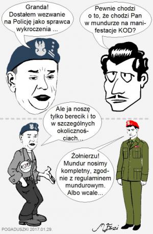 Pułkownik Mazguła, piewca kultury w stanie wojennym, dostał wezwanie na Policję. Od razu podniósł się krzyk wśród KOD-ziarzy, iż jest represjonowany za występowanie w mundurze na manifestacjach KOD-u. Sam zainteresowany twierdzi, że on tylko od czasu do czasu nosi "elementy munduru", Jako przykład podał beret.