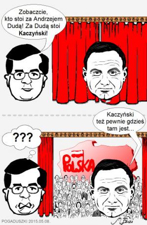Kampania prezydencka przed pierwszą tura dobiega końca. Komorowski widząc gwałtowny spadek poparcia, w swoim spocie postanowił nastraszyć Polaków. Ale Duda jest tak sympatyczny, że trudno nim straszyć dobrych ludzi. Złodzieje zapewne boją się go i bez straszenia. Ale zwykli Polacy go polubili. Czy można w takim razie postraszyć kimś innym? Kiedyś wyszło z Kaczyńskim. A więc sztab Komorowskiego zmajstrował spot "Za Dudą stoi Kaczyński". Ale chyba im nie wyszło...