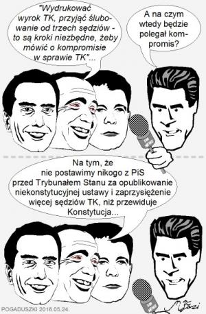 O ile pamiętam ze szkoły, kompromis zakłada zbliżenie stanowisk przy rezygnacji stron z części swoich racji. Po przyjęciu powyższych warunków wstępnych opozycji, kompromis byłby zbędny. Opozycja zyskała by wszystko, dodatkowo całkowicie niezgodnie z prawem. No, może w ramach kompromisu mogła by zaproponować PiS, że nie postawi nikogo z tej partii przed Trybunałem Stanu za złamanie Konstytucji, czyli publikowanie uchwały TK uchwalonej sprzecznie z ustawą oraz przekroczenie ustalonej w tejże Konstytucji ilości członków TK.