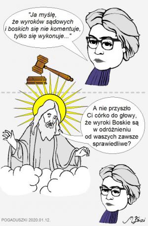 Szkoda, że pani prezes zapomniała, że wyroki boskie są z zasady sprawiedliwe, ale wyrokom sądowym można często sporo zarzucić. Gdyby ich nie komentować, to jak możliwe były by apelacje od tych ewidentnie niesprawiedliwych. A może chce, żeby było tak jak w pewnym mało obecnie śmiesznym kawale: