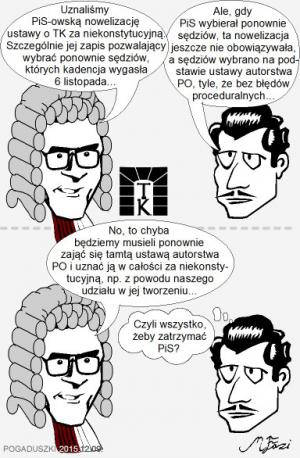 Ale, jeśli dobrze się zastanowimy, to dzisiejszy wyrok jest bez znaczenia, bo PiS wybrał nowych sędziów w oparciu nie o zakwestionowaną właśnie ustawę, ale o ustawę uchwaloną przez PO. Z niej TK zakwestionował jedynie prawo PO do wyboru 2 sędziów przed terminem. To PO samo złamało swoją ustawę wybierając kandydatów niezgodnie z obowiązującymi przepisami (brak rekomendacji 50 posłów), a więc wybór ten był nieważny, co potwierdził obecny Sejm w stosownej uchwale. Uchwała ta, w związku z nieprawidłowościami przy wyborze, uznała go za nieważny z mocy prawa. Następnie wybrano 5, już zaprzysiężonych dziś sędziów, zgodnie z przepisami tamtej, wysmażonej jeszcze przez PO ustawy. Bo inaczej się nie dało. Nowelizacja PiS nie weszła jeszcze w życie. Dzisiejszy wyrok może co najwyżej pokazać sposób w jaki należy konstruować kolejne nowelizacje ustawy o TK. W każdym razie nie może być podstawą do unieważnienia wyboru sędziów zaprzysiężonych przez Prezydenta Dudę, bo to nie ta ustawa.