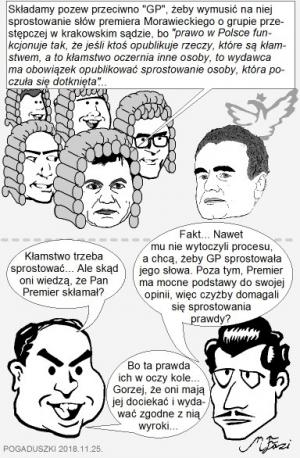 Dodatkowo żądanie od gazety sprostowania słów cytowanych za politykiem jest kuriozalna. Gazeta przekazuje stan faktyczny. Nie kreuje rzeczywistości, ale ją opisuje. To nie był tekst dziennikarza GP, ale tekst Premiera. Premier powiedział co powiedział i ewentualnie to on może sprostować swoje słowa. To jemu sąd może nakazać sprostowanie kłamliwej wypowiedzi, oczywiście jeśli będzie w stanie udowodnić, że zawierała kłamstwo. Gazecie można by co najwyżej wytoczyć proces, gdyby odmówiła publikacji nakazanego przez sąd politykowi sprostowania.