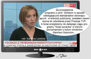 Niejaka red. Karolina Lewicka z TVP INFO tak bezczelnie i po chamsku poprowadziła w programie "Minęła 20-ta" wywiad z prof. Piotrem Glińskim, iż nawet prezes tejże instytucji musiał zauważyć, że: "Sposób prowadzenia programu odbiegał zdecydowanie od standardów, które obowiązują w telewizji publicznej" i zawiesił panią redaktor do odwołania. Odwołanie musiało przyjść szybko, bo już rano następnego dnia pani redaktor prowadziła program "Gość poranka". Widać TVP postanowiło pobawić się z widzami w ciuciubabkę: jest Lewicka, nie ma Lewickiej, jest Lewicka, nie ma....