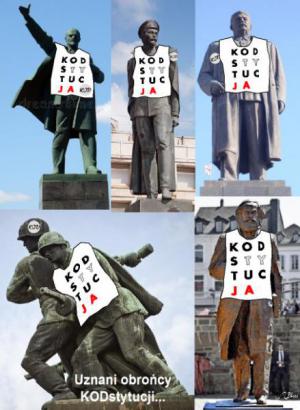 KOD-ziarze dopuścili się wczoraj masowej profanacji pomników znanych Polaków oraz kilku pomników postaci symbolicznych, jak Syrenka Warszawska, wrocławskie Krasnale czy Smok Wawelski. Pomniki ubrali w szmaty imitujące koszulki z napisem KONSTYTUCJA.
