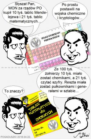 Następnie postanowili postawić na konkretne rodzaje sił zbrojnych. Jak wynika z ostatnich doniesień prasowych chodzi o kryptologię i wojska chemiczne. Świadczy o tym fakt, że w decydenci wojskowi Platformy dla 1/3 składu osobowego armii kupili w tym celu tablice matematyczne (21 tyś. szt.) i układy okresowe pierwiastków (10 tyś. sztuk). Oczywiście, jako najwyższej klasy sprzęt wojskowy, zostały one oznakowane logo MON. I na to między innymi poszło 31 mln. zł!