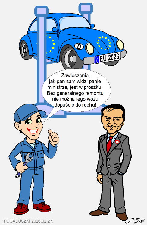 Pod jednym względem pan minister ma rację, Jeśli zawieszenie da się jeszcze naprawić, to samochodu nie trzeba wyrzucać na złom. Tak więc jeśli Unię Europejską da się skutecznie zaserwisować, to może warto spróbować. Ale serwis powinien być całkowity. Wymienić wszystkie wadliwe podzespoły, zaczynając od Komisji Europejskiej, TSUE, a w konsekwencji wyeliminować takie przeróbki, jak zielone łady, ETS-y, cele klimatyczne, GENDER i inne zbędne narośle. W zasadzie najlepszym rozwiązaniem byłby powrót do pierwotnej konstrukcji, czyli wspólnoty gospodarczej (EWG) nie obwarowanej ideologicznymi naroślami. Wspólnoty gospodarczej wolnych i niezależnych narodów.