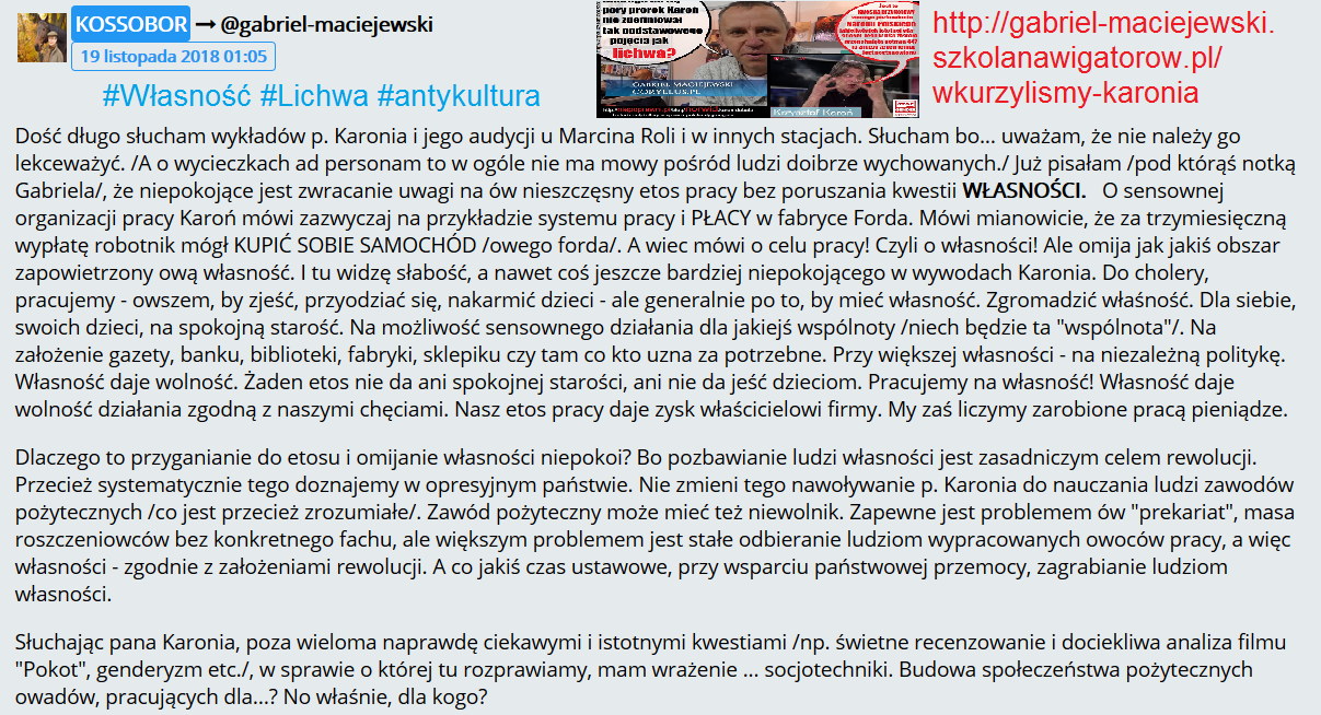 Dla mnie Maciejewski robi to celowo żeby Karonia zdyskredytować. Jeśli Karoń zacząłby rozprawiać o lichwie na starcie ma szlaban w środowiskach religijnych żydów. Jeśli nie rozprawia o lichwie jest oskarżany o antysłowiańskość i antypolskość, o sprzyjanie międzynarodówce syjonistycznej. Tak źle i tak niedobrze. Pisząc i mówiąc o socjalizmie i komunizmie dawniej i dziś rozprawia o żydokomunie. To jak dla mnie w zupełności wystarczy.