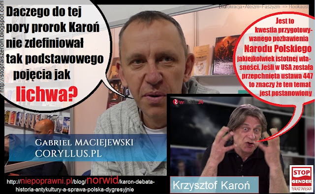 Dla mnie Maciejewski robi to celowo żeby Karonia zdyskredytować. Jeśli Karoń zacząłby rozprawiać o lichwie na starcie ma szlaban w środowiskach religijnych żydów. Jeśli nie rozprawia o lichwie jest oskarżany o antysłowiańskość i antypolskość, o sprzyjanie międzynarodówce syjonistycznej. Tak źle i tak niedobrze. Pisząc i mówiąc o socjalizmie i komunizmie dawniej i dziś rozprawia o żydokomunie. To jak dla mnie w zupełności wystarczy.