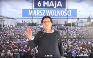 ” Cześć to ja — Ewa Kopacz. Jestem tu po to, żeby Was zaprosić na 6 maja, na wielki Marsz Wolności. Zamiast siedzieć przy grillu będziemy maszerować. A wiecie, dlaczego musimy tam być? Po to, żeby w Polsce kolejne długie weekendy były normalne, były serdeczne, były radosne. Będziemy o to walczyć właśnie szóstego. Chcę się tam z wami spotkać, serdecznie zapraszam”.