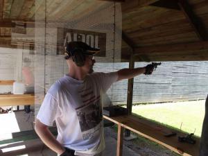Podczas zawodów niespodziewanie spotkałem znanego pisarza SF Andrzeja Ziemiańskiego z szanowną (również strzelającą sportowo) małżonką. Oboje strzelają i to celnie.