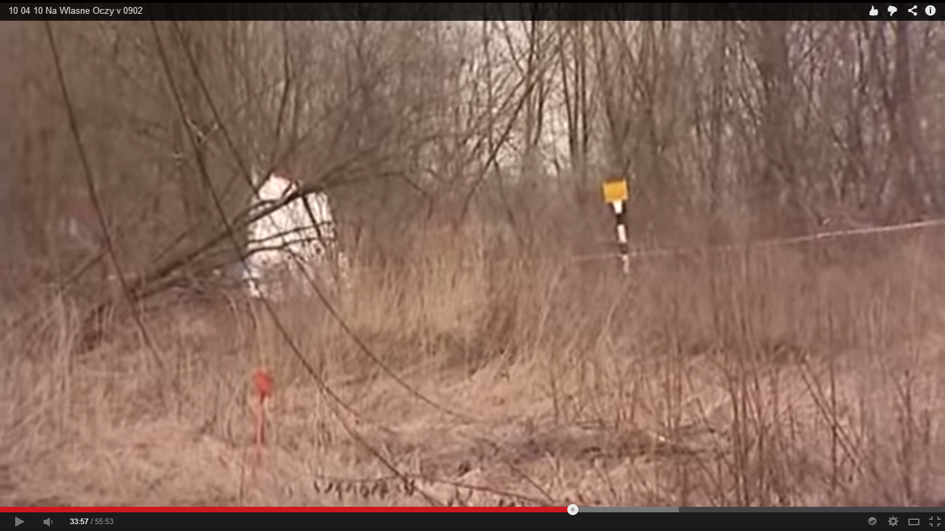 2) Marek Pyza: (godz. 12.02 polskiego czasu – relacja na żywo ze Smoleńska; 10 Kwietnia 2010): Przede wszystkim zdjęcia, które państwo przed chwilą widzieli, to pierwsze zdjęcia z tego miejsca zrobione przez jednego z pracowników TVP. Wszystko się wydarzyło około dwustu metrów stąd za tymi drzewami. Tam runął samolot z prezydentem Lechem Kaczyńskim na pokładzie około godziny dziesiątej (ósmej czasu polskiego – RM)