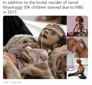 Oprócz brutalnych morderstw Jamala Khashoggi (dziennikarza Arabii Saudyjskiej zamordowanego 2 października w saudyjskim konsulacie w Turcji przyp. R.K.) 50 tys.dzieci zagłodzonych z powodu MBS w 2017 roku".