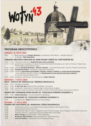 Pierwszego dnia obchodów, w sobotę 8 lipca, w Chełmskiej Bibliotece Publicznej zaprezentowana zostanie wizualizacja Muzeum Ofiar Rzezi Wołyńskiej – Centrum Prawdy i Pojednania. Instytucja powstanie do 2027 roku na terenie kompleksu dawnych carskich budynków przy ul. Hrubieszowskiej 102 w Chełmie. Szczgółowy plan wszystkich uroczystości dołączony na plakacie oraz na stronie: https://samorzad.gov.pl/web/miasto-chelm/80-rocznica-krwawej-niedzieli-n...