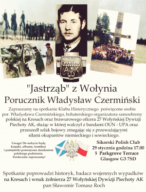 The Sikorski Polish Club in Glasgow City, Scotland. Zapraszamy na spotkanie Klubu Historycznego poświęcone osobie por. Władysława Czermińskiego ps. „Jastrząb”, organizatora samoobrony polskiej na Wołyniu, opierającej się zbrodniczej działaności ukraińskich nacjonalistów OUN - UPA oraz oficera 27 Wołyńskiej Dywizji Piechoty AK, wraz z którą przeszedł szlak bojowy zmagając się z przeważającymi siłami okupanta niemieckiego i sowieckiego. Jest to sylwetka warta przybliżenia nie tylko ze względu na osobiste przymioty bohatera naszego spotkania, które zostały sprawdzone w trudnych czasach, ale też ze względu na współczesne próby symetryzacji zagadnienia rzezi wołyńskiej, czy też z drugiej strony, pojawiającej się publicystyki historycznej atakującej polskie podziemie o brak adekwatnej reakcji na wypadki na Kresach. Czytaj więcej: ]]>https://www.facebook.com/events/280554007473142]]>