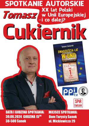 Uprzejmie zapraszamy na spotkanie autorskie z p. Tomaszem Cukiernikiem – publicystą oraz autorem książek. Prelekcja odbędzie się w dniu 30.06.2024 r. w Domu Turysty w Sanoku przy ul. Mickiewicza 29 o godz. 15.00.