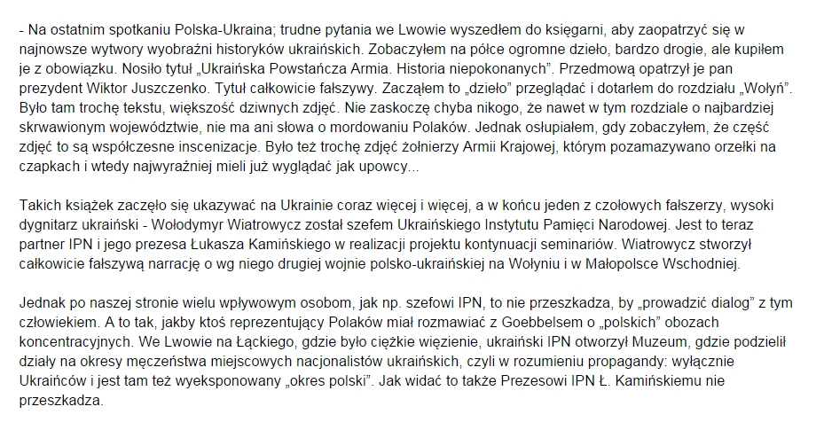 - Na ostatnim spotkaniu Polska-Ukraina; trudne pytania we Lwowie wyszedłem do księgarni, aby zaopatrzyć się w najnowsze wytwory wyobraźni historyków ukraińskich. Zobaczyłem na półce ogromne dzieło, bardzo drogie, ale kupiłem je z obowiązku. Nosiło tytuł „Ukraińska Powstańcza Armia. Historia niepokonanych”. Przedmową opatrzył je pan prezydent Wiktor Juszczenko. Tytuł całkowicie fałszywy. Zacząłem to „dzieło” przeglądać i dotarłem do rozdziału „Wołyń”. Było tam trochę tekstu, większość dziwnych zdjęć. Nie zaskoczę chyba nikogo, że nawet w tym rozdziale o najbardziej skrwawionym województwie, nie ma ani słowa o mordowaniu Polaków. Jednak osłupiałem, gdy zobaczyłem, że część zdjęć to są współczesne inscenizacje. Było też trochę zdjęć żołnierzy Armii Krajowej, którym pozamazywano orzełki na czapkach i wtedy najwyraźniej mieli już wyglądać jak upowcy...