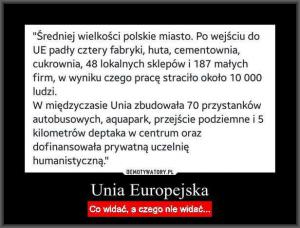 Te warunki unijne były od początku przez władze w Warszawie akceptowane, ale starannie ukrywane i nieznane nawet parlamentarzystom. Tym bardziej społeczeństwo, uczestniczące w referendum o przystąpieniu do Unii Europejskiej, nie miało pojęcia o kosztach takiej aneksji. Władze stopniowo podjęły realizację warunków unijnych, w ramach ogólnie promowanej transformacji. Tak więc oprócz szerokiej akcji uwłaszczania się nomenklatury i prominentów na majątku narodowym, oprócz akcji prywatyzacji i wyprzedaży przedsiębiorstw za granicę, była jeszcze realizowana państwowa akcja niszczenia i burzenia obiektów przemysłowych. Do tego dołączyła się akcja zagranicznych korporacji, ukierunkowana na wrogie przejęcia, niszczenie polskiej konkurencji oraz opanowanie naszego rynku. Zgubne efekty takiej transformacji zasygnalizowaliśmy powyżej.