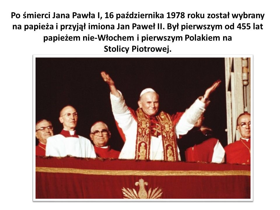 Wybór papieża z Polski był niezwykłym wydarzeniem w dziejach świata, ale, jak się okazało, zapowiedzianym w poetyckim proroctwie innego Polaka. Juliusz Słowacki napisał w 1848 r.: „Pośród niesnasek Pan Bóg uderza/W ogromny dzwon,/Dla słowiańskiego oto papieża/Otworzył tron, (...)// Twarz jego słowem rozpromieniona,/Lampa dla sług,/Za nim rosnące pójdą plemiona/W światło, gdzie Bóg./Na jego pacierz i rozkazanie/Nie tylko lud -/Jeśli rozkaże, to słońce stanie,/Bo moc - to cud!