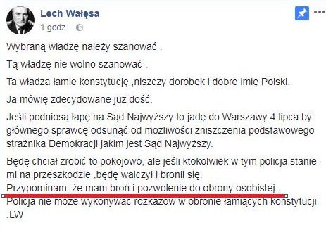 Teraz na Facebooku Lecha Wałęsy widnieje post w okrojonej formie. Mimo braku wzmianki o broni i walce z policją, nadal mowa o „fizycznym odsunięciu”.