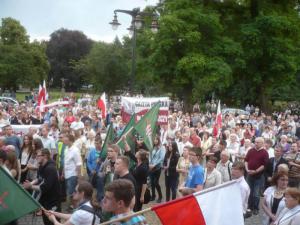 Tymczasem na placu modlono się śpiewano religijne i patriotyczne pieśni, odmawiano modlitwę do świętego archanioła. Wznoszono okrzyki: Wielka Polska katolicka, zwyciężymy, Bóg Honor i Ojczyzna. Przemawiali posłowie: Tomasz Latos, Bartosz Kownacki, Jan Ardanowski. W manifestacji uczestniczyli też radni PiS Stefan Pastuszewski, Marek Gralik. Oraz Jezuici ojcowie Andrzej Lemiesz i Mieczysław Łusiak. W końcu ojciec Andrzej poświęcił budynek teatru, by odpędzić złego ducha. Kończąc stwierdził: poświęciłem też telewizję i nie uciekła, co mnie trochę zdziwiło. Pod koniec wiecu rozeszła się wieść, że projekcję Golgoty Piknik wznowiono w innej sali. Manifestanci przenieśli się w tym kierunku. Wyciem syren, gwizdem starali się zakłócić widzom oglądanie.