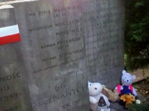 Cóż to takiego? Spiesznym krokiem dochodzę do grobu: kolorowe maskotki! Ktoś poukładał barwne zabawki na bratniej mogile. Czytam nazwiska na tablicy. Jest! Lurie! Znam ich historię .Trójka dzieciaków, które wraz z matką i sąsiadami z kamienicy, zapędzili oprawcy pod ścianę śmierci. Dzieci :Wiesio 11 lat, Ludmiła – 6 i Leszek - 3 latka),trzymały się matki i siebie nawzajem. Ona, w dziewiątym miesiącu ciąży, obładowana tobołkami, w przerażeniu i zgrozie, ledwo nadążała za tłumem.