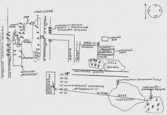 Za pasem leśnym w zachodniej części znajduje się opustoszały teren o powierzchni około 18x30 metrów, w jego północnej części (bliżej lasu) znajduje się uliczna toaleta drewniana. W promieniu 15 metrów od tej toalety na ziemi są porozrzucane fragmenty samolotu i odłamki drzew. Bardziej na południe, w odległości około 20 metrów od toalety znajduje się salon samochodowy „Awtomotors”. Powierzchnia, na której stoi salon, wynosi około 17x40 metrów. W chwili przeprowadzenia oględzin na obszarze salonu jest kilka samochodów. Przy zachodniej części ogrodzonego obszaru salonu samochodowego jest zaparkowany samochód „Opel vectra” – uniwersalny, ciemnego koloru, z jego lewej strony w odległości około 2 metrów na ziemi leży metalowy fragment samolotu. Bardziej na południe, na terenie salonu znajduje się biuro sprzedaży o wymiarach około 5x2,5 metra, na jego dachu znajdują się odłamki, gałęzie drzew. Z prawej strony od wejścia do biura, na ziemi, znajdują się również odłamki i gałęzie drzew.