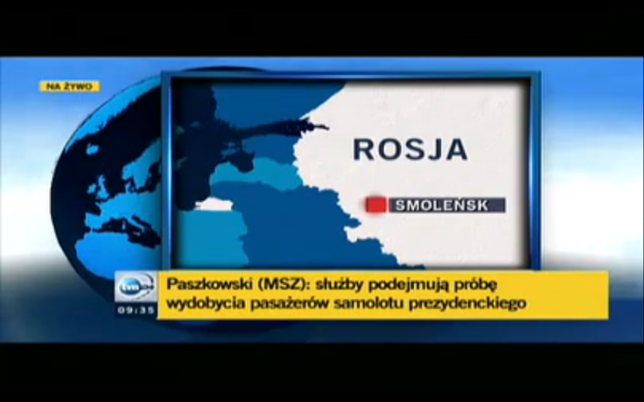 2) Marek Pyza: (godz. 12.02 polskiego czasu – relacja na żywo ze Smoleńska; 10 Kwietnia 2010): Przede wszystkim zdjęcia, które państwo przed chwilą widzieli, to pierwsze zdjęcia z tego miejsca zrobione przez jednego z pracowników TVP. Wszystko się wydarzyło około dwustu metrów stąd za tymi drzewami. Tam runął samolot z prezydentem Lechem Kaczyńskim na pokładzie około godziny dziesiątej (ósmej czasu polskiego – RM)