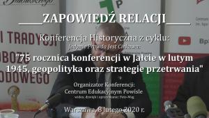Konferencja Historyczna w 75 rocznicę konferencji w Jałcie w 1945 : "75 rocznica konferencji w Jałcie w lutym 1945, geopolityka oraz strategie przetrwania" ulica Mikołaja Kopernika 30, 00-336 Warszawa, Polska, sobota, 8 lutego 2020 r., godz. 11.00 Organizator: Centrum Edukacyjne Powiśle - prowadzenie Rafał Mossakowski.